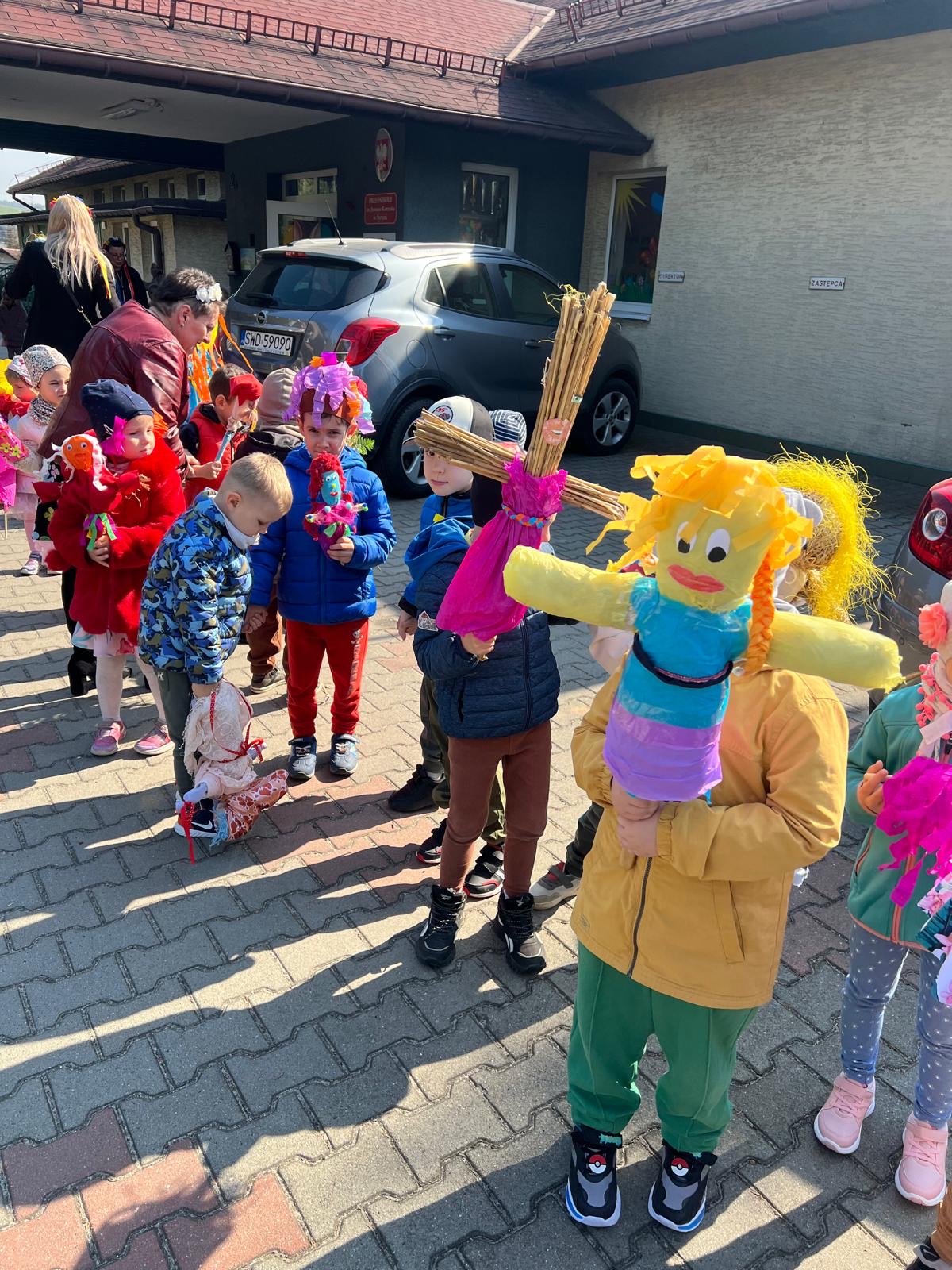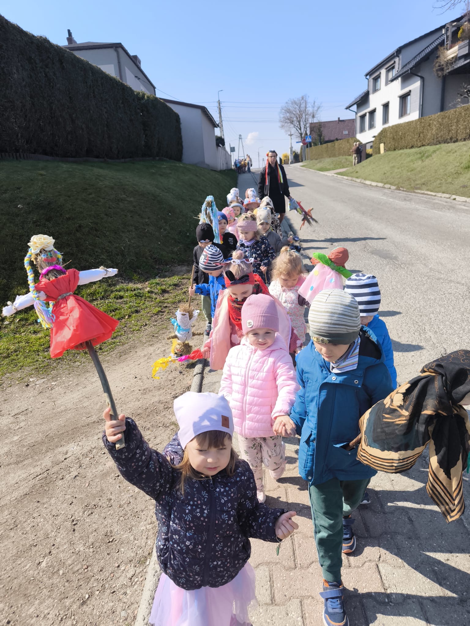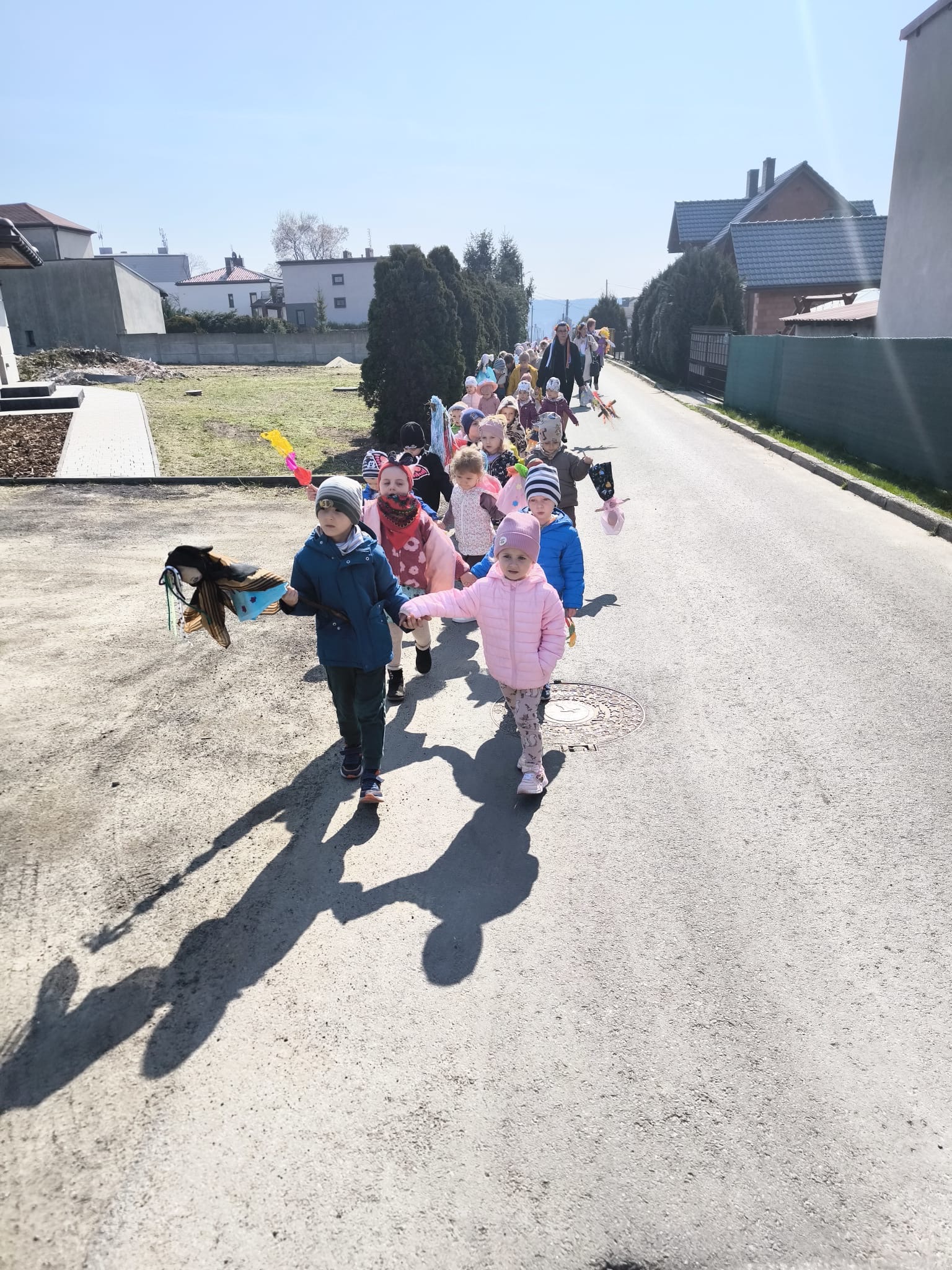 Najważniejszym momentem dnia był uroczysty przemarsz. Dzieci, trzymając swoje Marzanny, wyruszyły na spacer w okolicy przedszkola. Wspólnie śpiewały wiosenne piosenki, recytowały rymowanki i radośnie żegnały zimę. Kolorowy pochód wzbudzał zainteresowanie przechodniów, a uśmiechy dzieci i ich entuzjazm udzielały się wszystkim wokół.