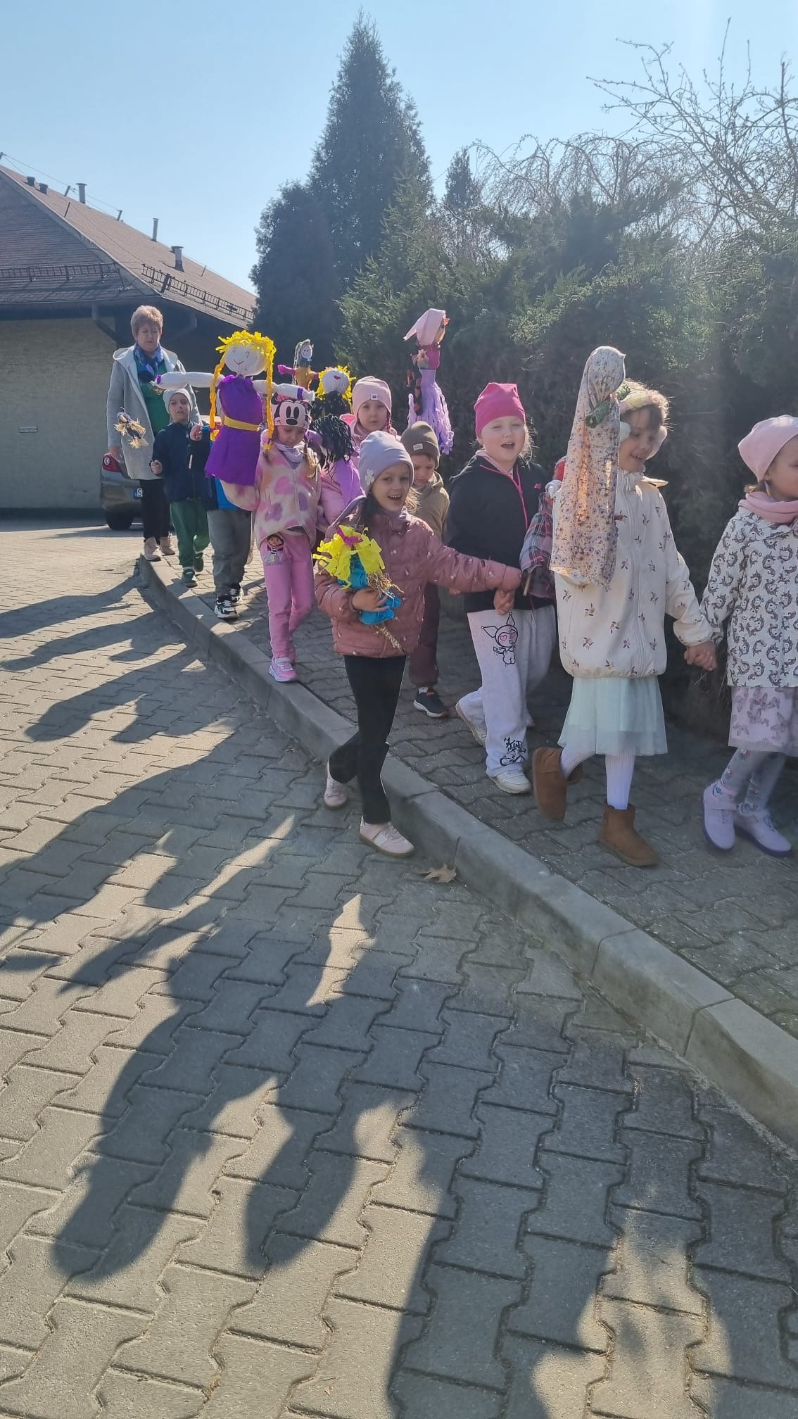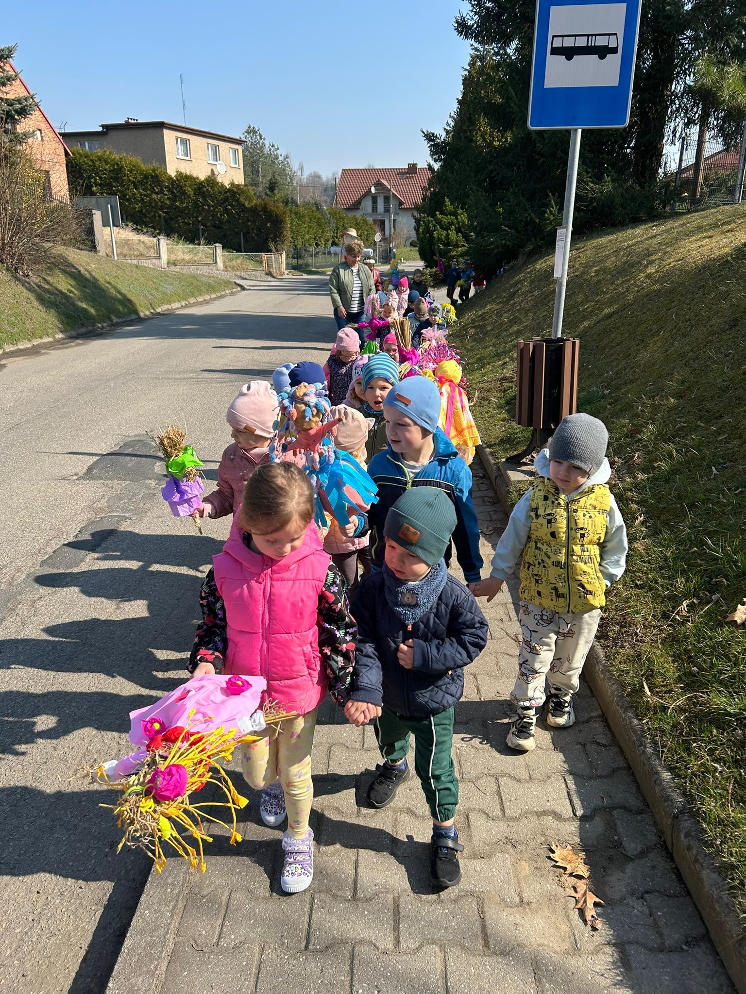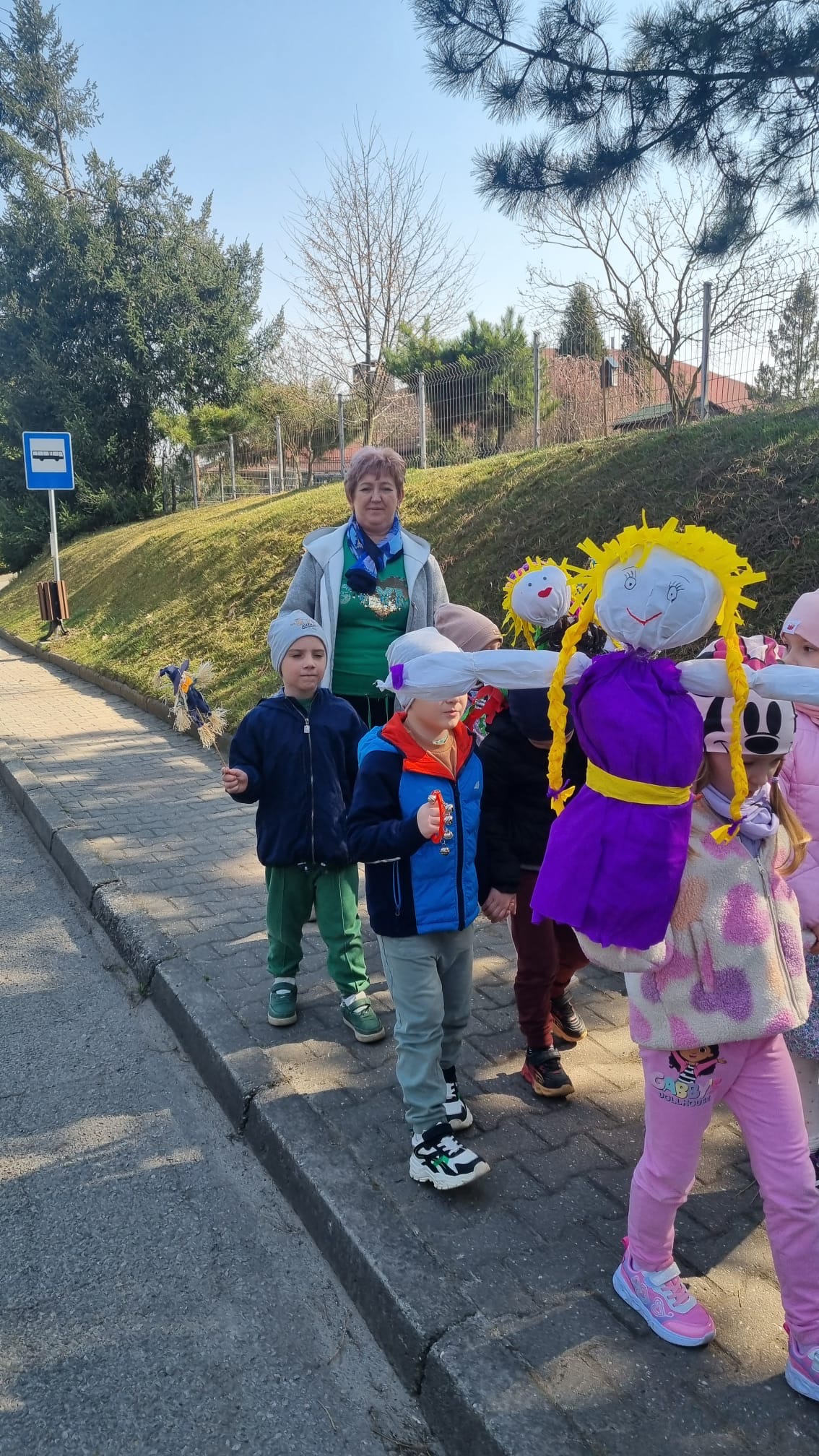 Najważniejszym momentem dnia był uroczysty przemarsz. Dzieci, trzymając swoje Marzanny, wyruszyły na spacer w okolicy przedszkola. Wspólnie śpiewały wiosenne piosenki, recytowały rymowanki i radośnie żegnały zimę. Kolorowy pochód wzbudzał zainteresowanie przechodniów, a uśmiechy dzieci i ich entuzjazm udzielały się wszystkim wokół.