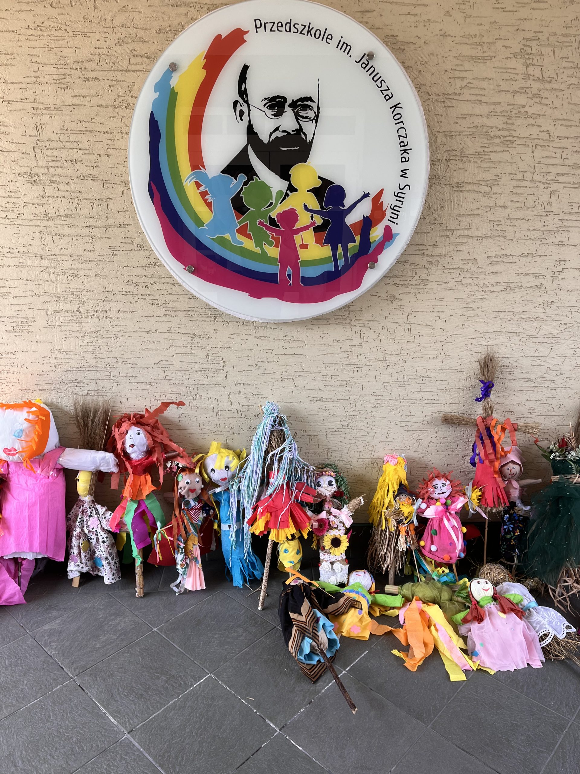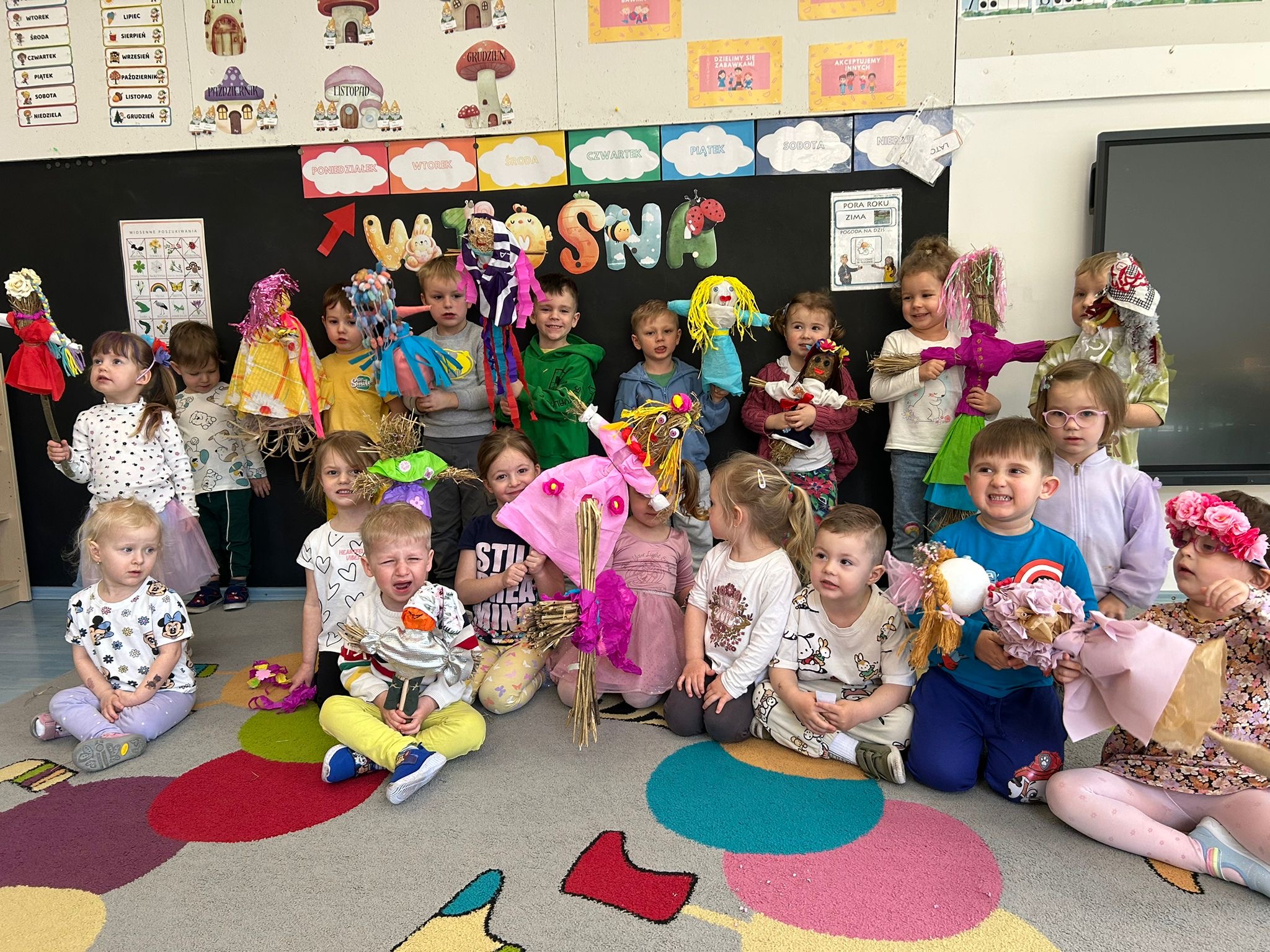 W tym roku szczególnym elementem przygotowań było wspólne tworzenie Marzann w domach. Dzieci wraz z rodzicami wykonały przepiękne, pomysłowe kukły, wykorzystując różnorodne materiały. Każda Marzanna była inna i wyjątkowa, co sprawiło, że przedszkolny korytarz zamienił się w barwną wystawę pełną kreatywności i rodzinnego zaangażowania.