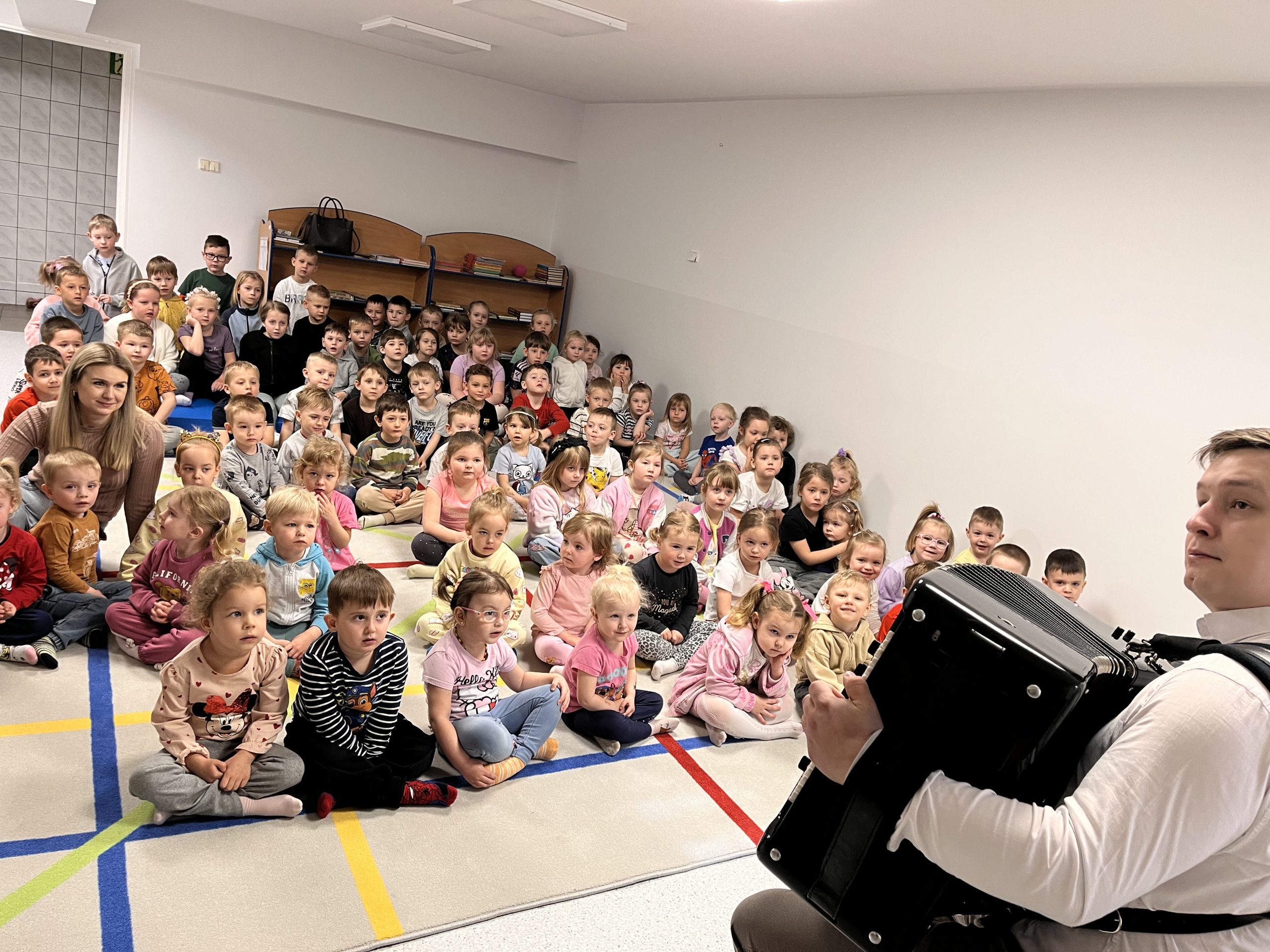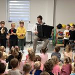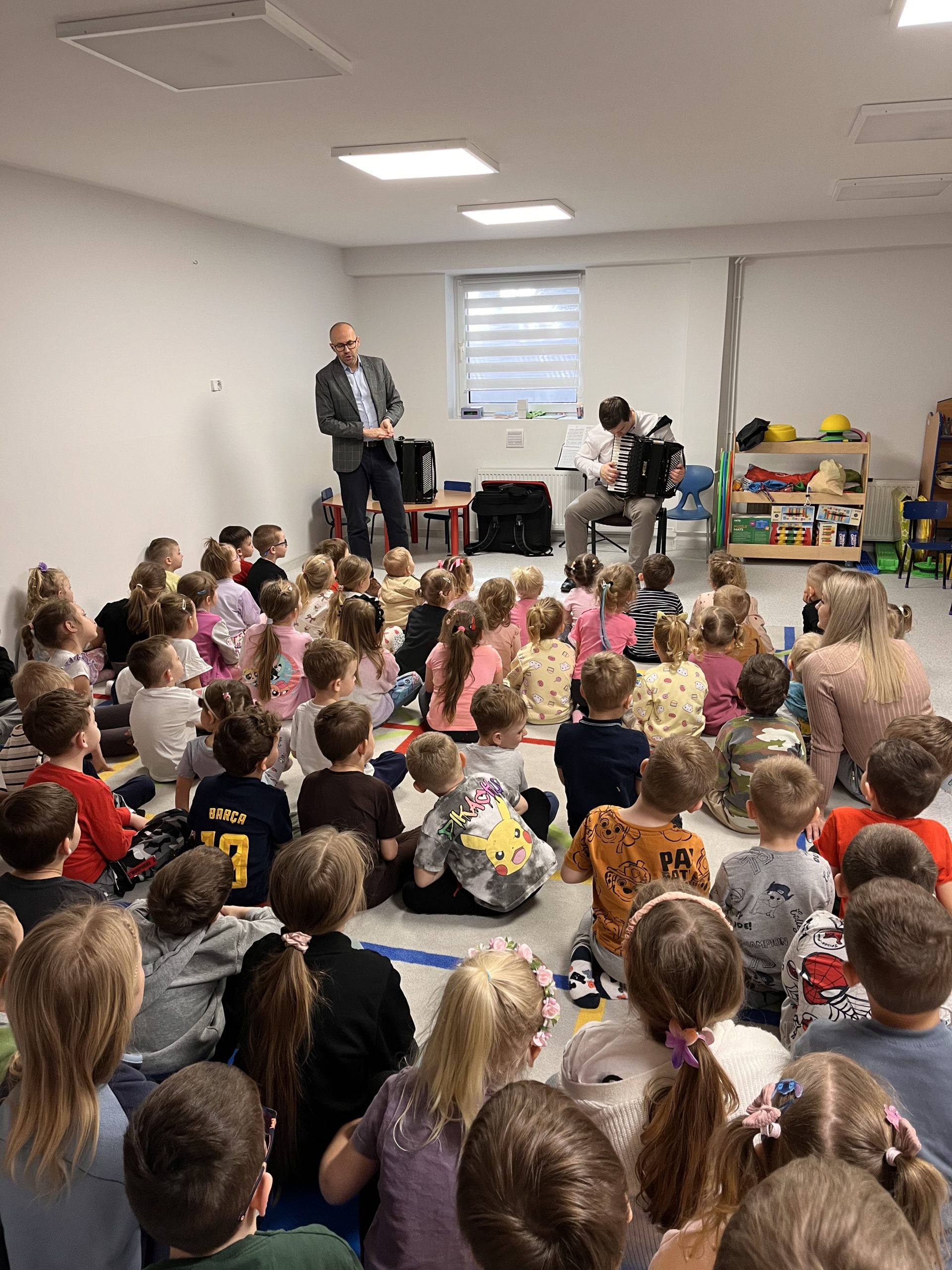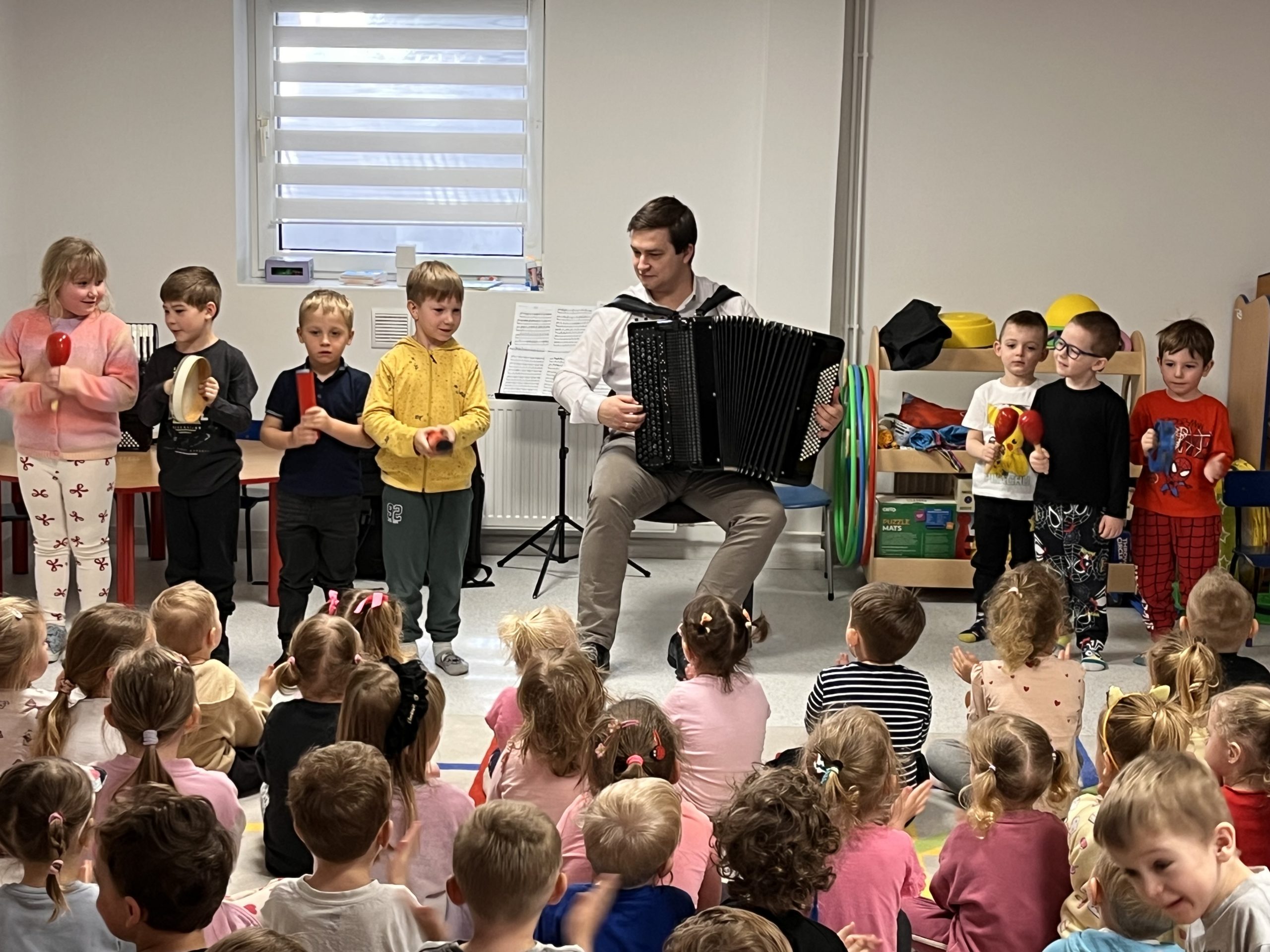 Podczas spotkania dzieci miały okazję poznać bliżej akordeon – instrument, który wzbudził ogromne zainteresowanie zarówno swoim wyglądem, jak i brzmieniem. Prowadzący koncert w przystępny i pełen humoru sposób opowiedział o budowie akordeonu, jego możliwościach oraz zaprezentował różnorodne utwory muzyczne – od wesołych melodii po bardziej nastrojowe kompozycje.