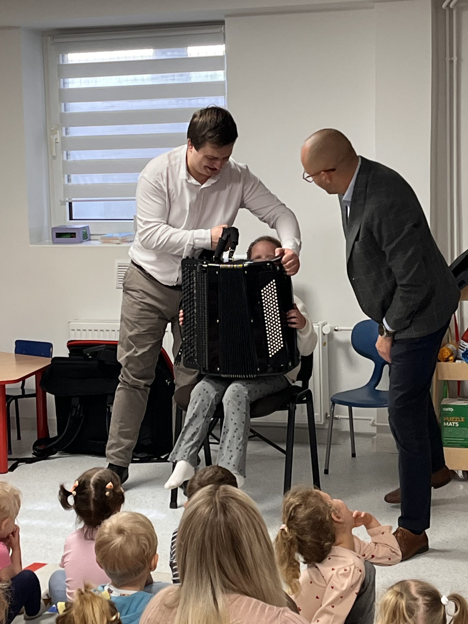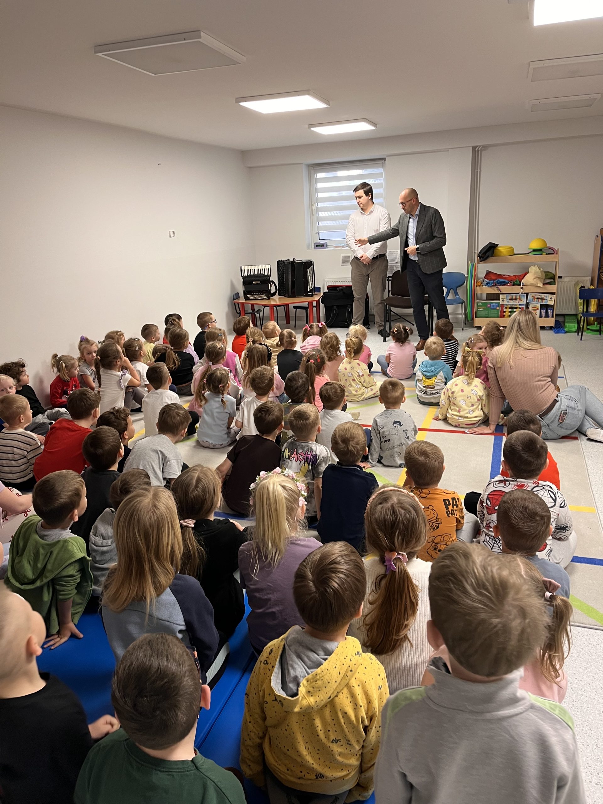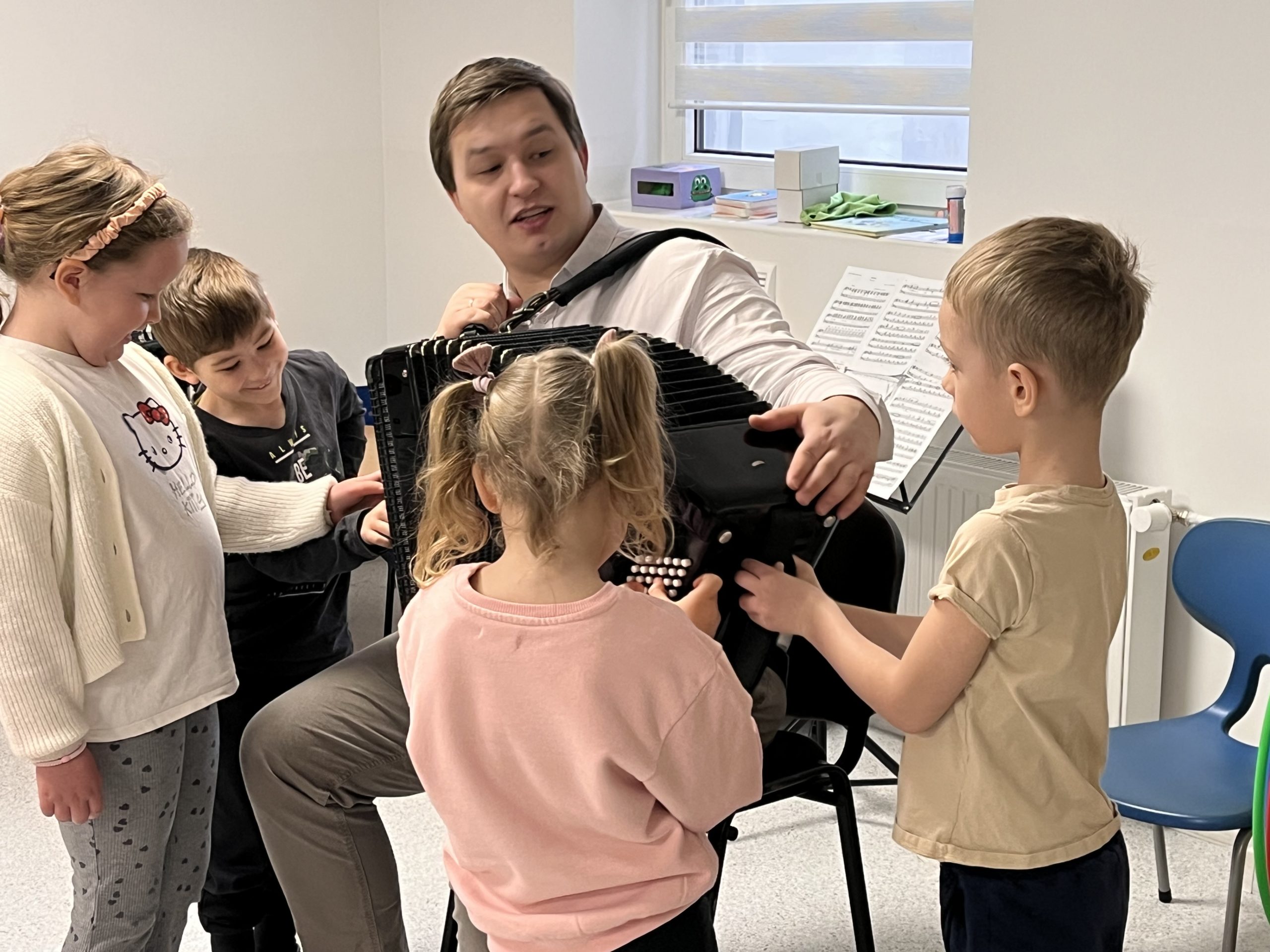 Podczas spotkania dzieci miały okazję poznać bliżej akordeon – instrument, który wzbudził ogromne zainteresowanie zarówno swoim wyglądem, jak i brzmieniem. Prowadzący koncert w przystępny i pełen humoru sposób opowiedział o budowie akordeonu, jego możliwościach oraz zaprezentował różnorodne utwory muzyczne – od wesołych melodii po bardziej nastrojowe kompozycje.