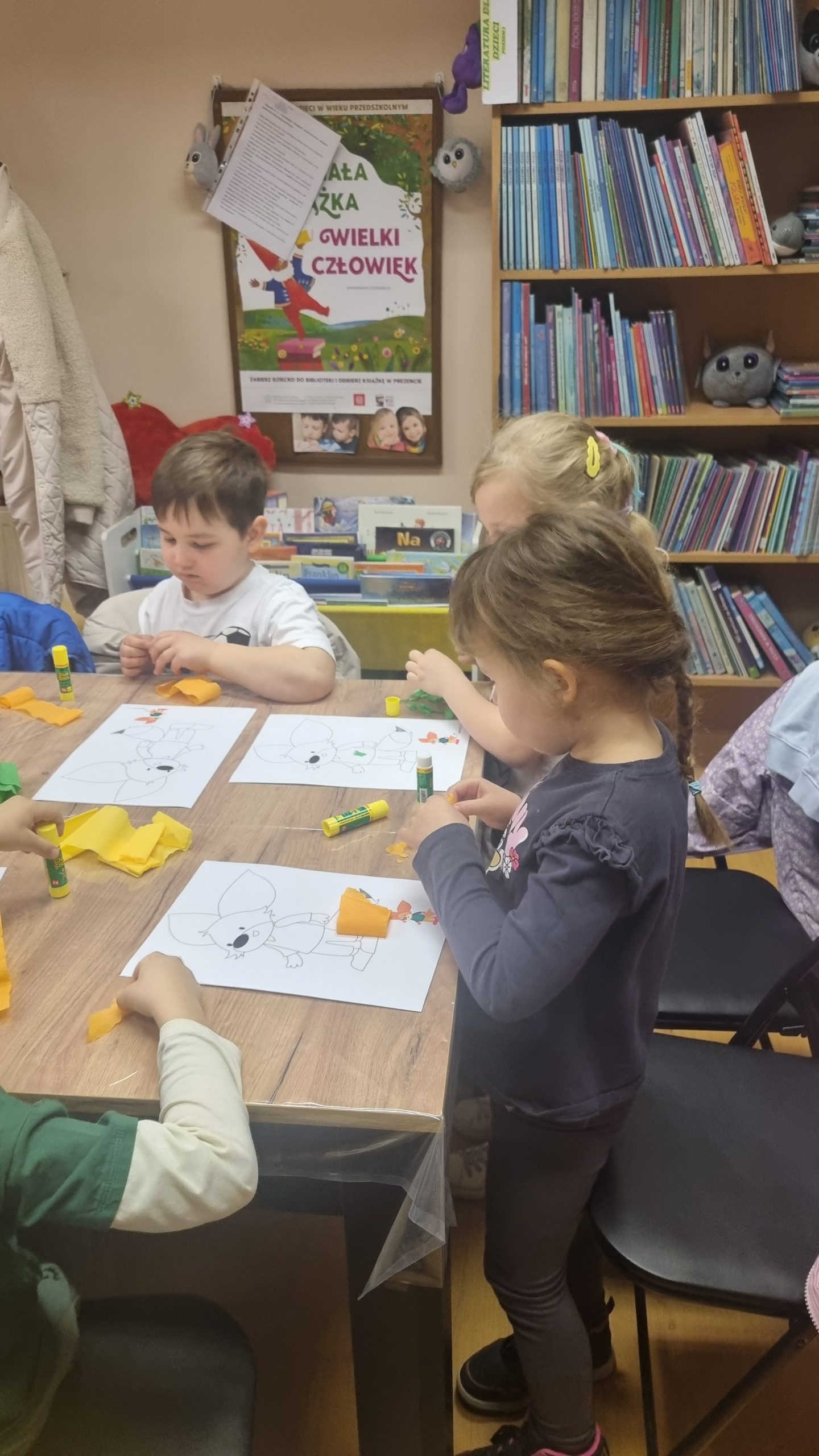 Przedszkolaki chętnie dzieliły się swoimi doświadczeniami i wspólnie zastanawiały się, dlaczego warto być cierpliwym. Na zakończenie wykonały pracę plastyczną – wyklejały sylwetkę Fenka kawałkami bibuły. Zadanie to wymagało skupienia i dokładności, dzięki czemu dzieci mogły w praktyce poćwiczyć swoją cierpliwość.