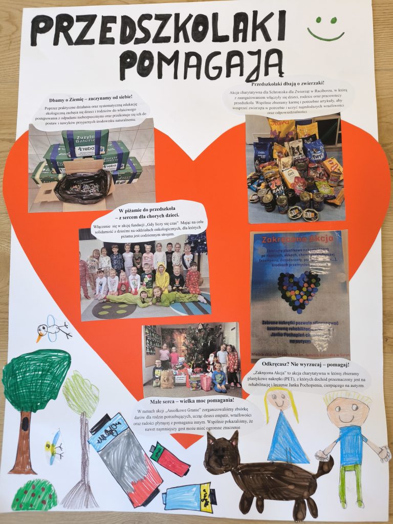 Wykonanie plakatu metodą kolażu realizowaliśmy wspólnie z dziećmi przedszkolnymi. Na początku przygotowaliśmy tło z brystolu, a następnie rozmawialiśmy o tym, w jaki sposób można pomagać innym osobom oraz środowisku. Dzieci wybierały zdjęcia z prowadzonych w naszej placówce akcji, przedstawiających m.in. zbieranie zużytych baterii i plastikowych nakrętek, pomoc chorym dzieciom, zbiórkę karmy dla schroniska oraz wsparcie dla dzieci z rodzin zastępczych.